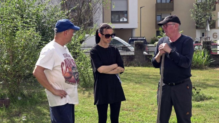 Ella möchte sich einen Platz im Gemeinschaftsgarten zum Anpflanzen verschiedener Gemüse sichern und ist die erste Interessentin bei Michael und Lothar