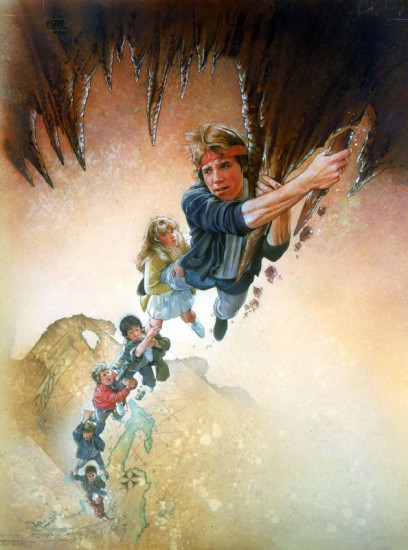 John Matuszak wearing Superman shirt, Jeff Cohen as Chunk, Ke Huy Quan as Data, Martha Plimpton as Stef and Sean Astin as Mikey wearing beanies; Corey Feldman as Mouth, Josh Brolin as Brand, Kerri Green as Andy wearing earmuffs, all sittng on rocky ledge, laughing