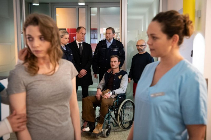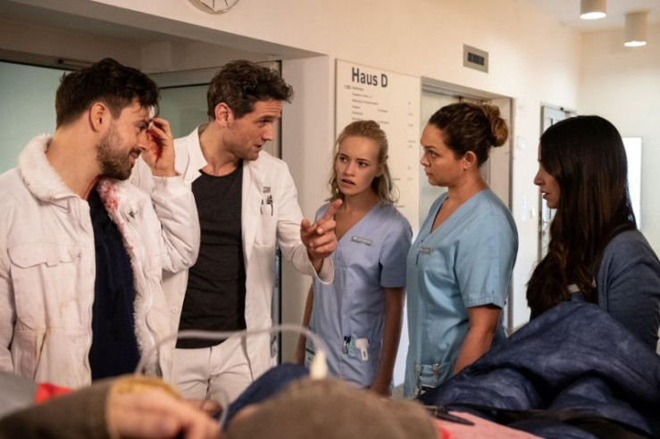 Während Dr. Sebastian Sander (Oliver Frank, r.) seinen Patienten Viktor Adler (Christopher Reinhardt, liegend) behandelt, teilt Schwesternschülerin Kiki (Valerie Huber, l.) ihren Verdacht Nora (Mimi Fiedler, 2.v.r.) mit.