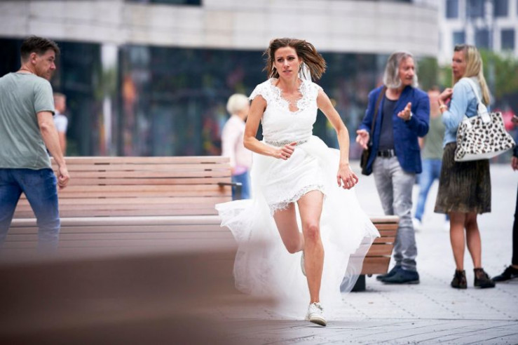Jenny (Katrin Heß, hinten) muss ihren Job als Personenschützerin auch im Brautmodeladen professionell ausführen. Die Gefahr eines Anschlags ist noch lange nicht gebannt. Maja (Myra Eetgerink, r.) und deren Freundin und Geschäftspartnerin Sophie (Maxine Kazis) versuchen sich bei den Vorbereitungen zur Hochzeit nicht stören zu lassen.