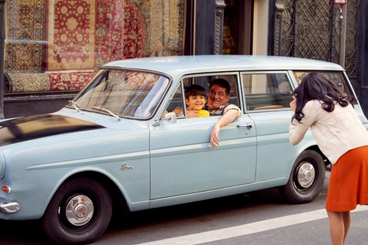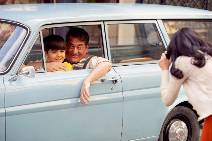 Rückblende (1977): Der achtjährige Semir (Ilia Djahed) posiert mit seinem Vater Abdulkabir (Hasan Ali Mete) vor dem Teppichladen der Familie für ein Foto, das seine Mutter Selma (Pina Ernicin) macht.