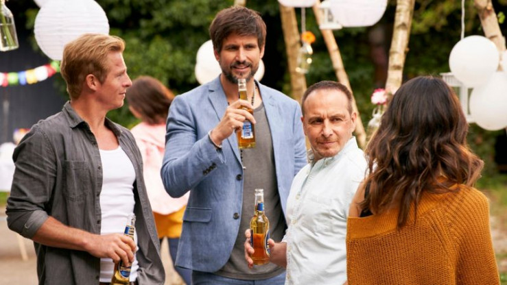 Semirs (Erdogan Atalay, r.) Party zu seinem 50sten Geburtstag kann endlich steigen. Ben (Tom Beck) und Paul (Daniel Roesner, l.) sind erleichtert.