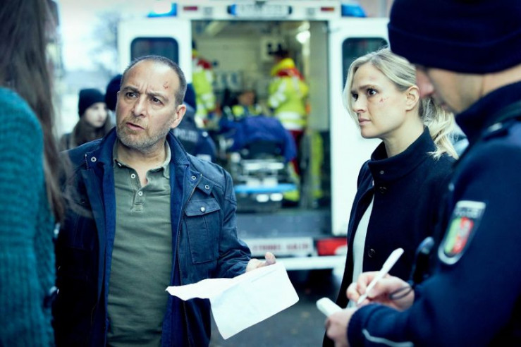 Malte (Max Hemmersdorfer, 2.v.l.) wurde während einer Demonstration von einem Amokläufer verletzt. Vicky (Pia Stutzenstein, 2.v.r.) und Semir (Erdogan Atalay) befragen ihn nach der Amokfahrt.