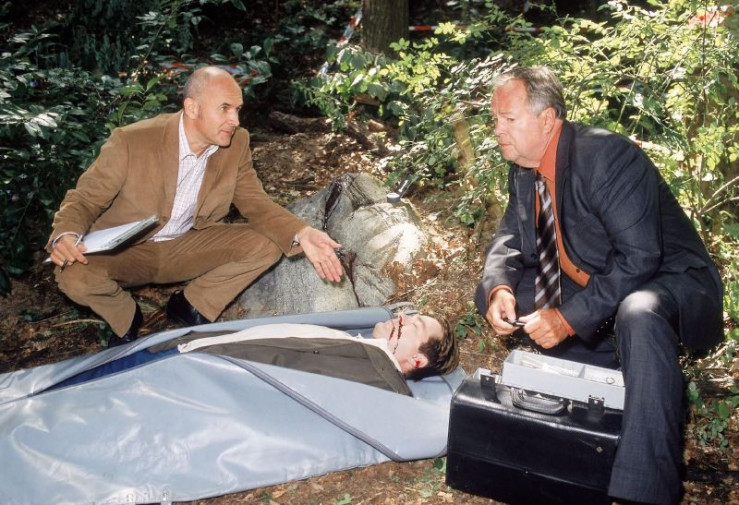 Dr. Duhler (Klaus Schindler, li.) erklärt Kommissar Kehler (Wolfgang Bathke), dass er bei der Leiche Kopfverletzungen feststellen kann, die auf Gewalteinwirkung hindeuten.