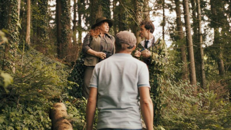 Jägerin Frau Dorlinger (Petra Berndt), Florian Eder (Florian Brückner, Rückansicht), Journalist Herr Stabenbuch (Tobias Krell)