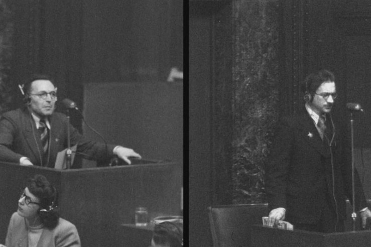 Zwei Holocaust-Überlebende machen ihre Aussage bei den Nürnberger Prozessen.