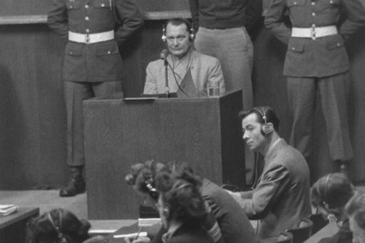 Hermann Göring (mitte) bei seiner Aussage im Rahmen der Nürnberger Prozesse.