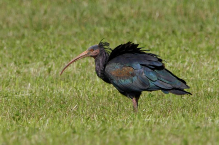 Ein Waldrappe sucht auf einer gemähten Wiese nach Insekten.