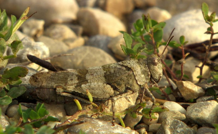 Eine blauflügelige Ödlandschrecke in der Fröttmaninger Heide.