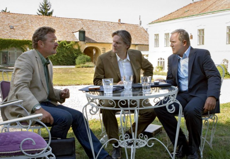 Jakob Ressler (Ferry Öllinger, links), der vorübergehend das Bürgermeisteramt des erkrankten Georg Plattner übernommen hat, lehnt jede Unterstützung des von Georg initiierten Wellness-Projekts durch die Stadtgemeinde Rust ab, nachdem er mit Thomas' (Harald Krassnitzer, rechts) Hilfe Ungereimtheiten im Kaufvertrag für das Schloss Bergham entdeckt hat. Dessen Besitzer Andreas Koblenz (Max Herbrechter) droht ein lukratives Geschäft zu entgehen.