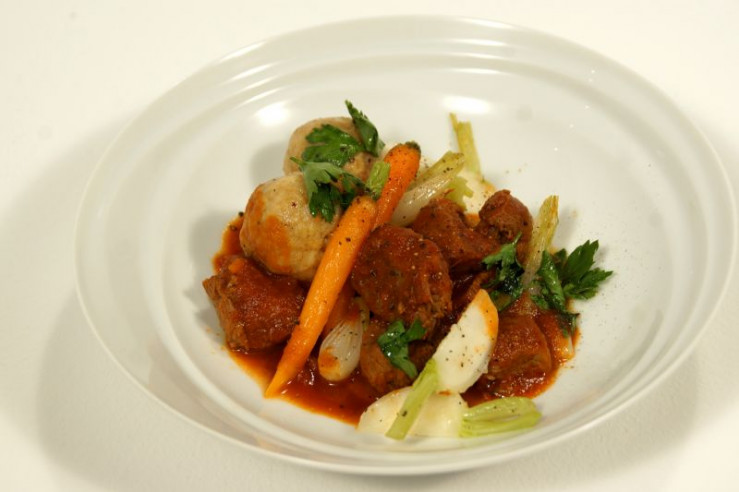 Hans Jörg Bachmeier präsentiert Bröselknödel mit Tomaten-Lamm-Ragout.