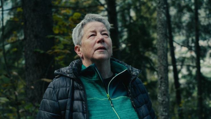 Franca Papi, die Mutter von Andrea Papi, der von einem Bären getötet wurde, ist im Wald in der Nähe ihres Dorfes, wo sich die Tragödie ereignete.