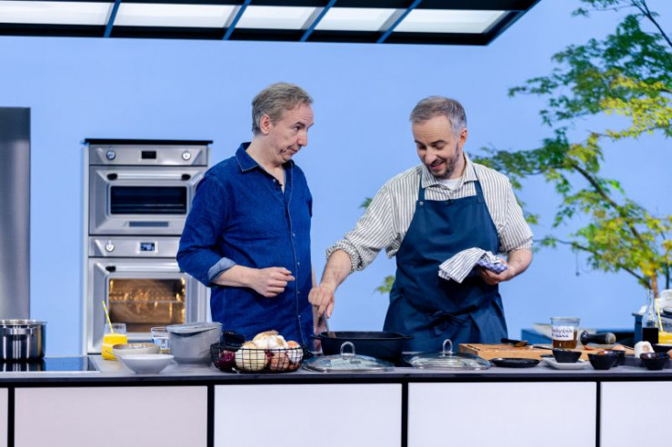 Moderator Jan Böhmermann (r.) gemeinsam mit seinem Gast, dem Sänger und Podcast-Kollegen Olli Schulz (l.), in der Küche von "Böhmi brutzelt".