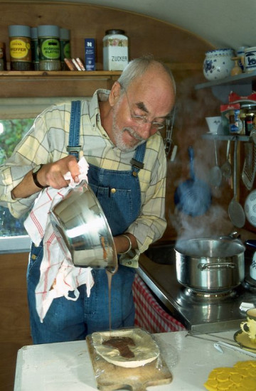Tante Martha (Angela Brunner, r.) ist überglücklich, denn Peter (Peter Lustig, l.) hat ihr einen Schokoladen-Gott gegossen und sie dazu noch zu einem Schokoladenfondue eingeladen.