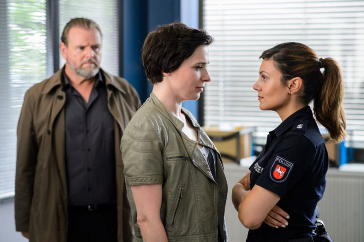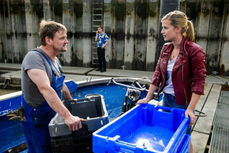 Von Insas Cousin Onno (Andy Gätjen, l.) erfahren Insa (Theresa Underberg, M.) und Henk (Maxim Mehmet, r.) interessante Details zu einem geplanten Neubauprojekt.