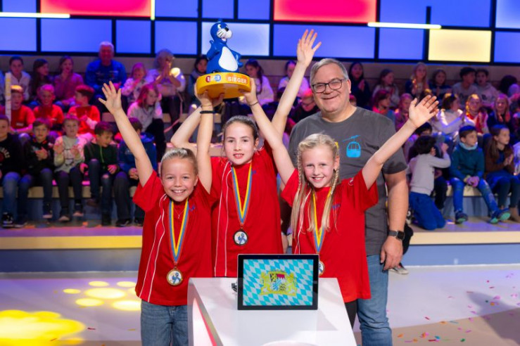 Das rote Team aus Bayern freut sich über den Piet-Flosse-Pokal.