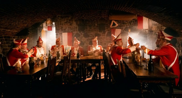 Die Roten Funken während einer Mitgliederversammlung in einem Kölner Gewölbe.