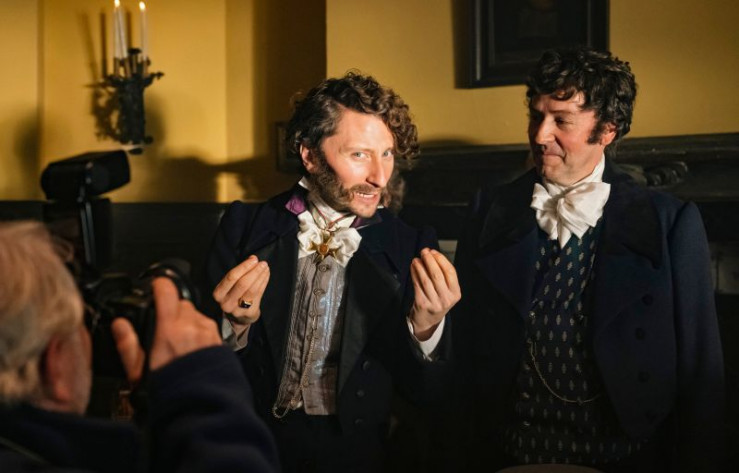 Die beiden Gründer des festordnenden Komitees im Jahres 1823 bei einer Pressekonferenz Heinrich von Wittgenstein (l, Moritz Heidelbach) und Matthias Joseph de Noël (r, Piet Fuchs).