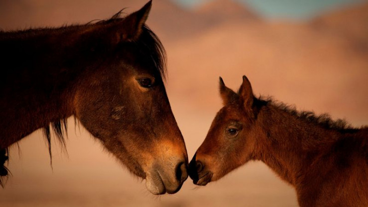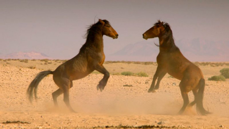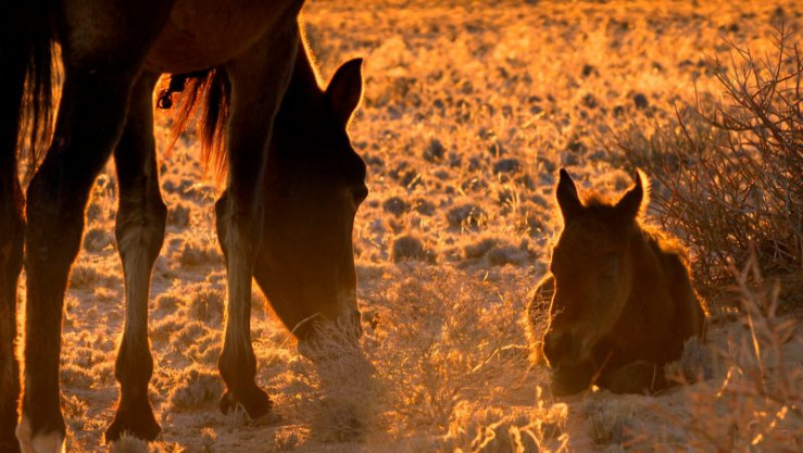 Die Pferde haben keine dieser Evolutionstricks - sie sind keine Wüsten-, sondern Steppentiere. Ihnen hilft nur ihr angeborenes Sozialverhalten - nach dem Motto: gemeinsam stark. So bilden sie bei Angriffen von Hyänen einen schützenden Pulk um die Jungtiere. Oder sie lecken sich gegenseitig ab, um ihren Salzhaushalt mit dem Schweiß des anderen aufzubessern. Die Clans werden von den Tieren angeführt, die am stärksten sind, egal ob Hengst oder Stute. So behaupten sich Namibias Wüstenpferde schon 100 Jahre lang und prägen den "Wilden Westen Afrikas".