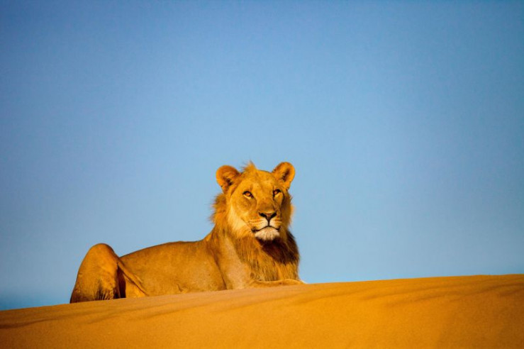 Löwe liegt auf einer Sanddüne in der Wüste Namib.