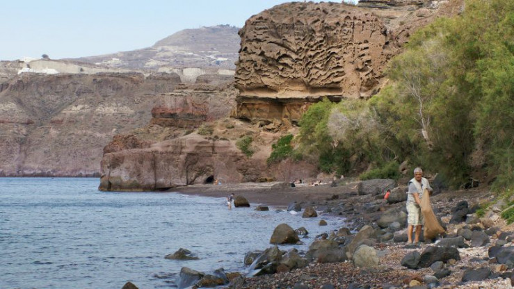 Der Sand der Strände besteht aus vulkanischen Materialien, die von Wind und Wellen zermahlen wurden. Im flachen Wasser wachsen Seegraswiesen, ein streng geschütztes und wertvolles Ökosystem. Wie überall auf der Welt ist Müll ein Problem, weshalb einheimische Taucher wie Dimitris Kambanos ein Aktionsbündnis gegründet haben, um die Unterwasserwelt Santorins vom Unrat zu befreien.