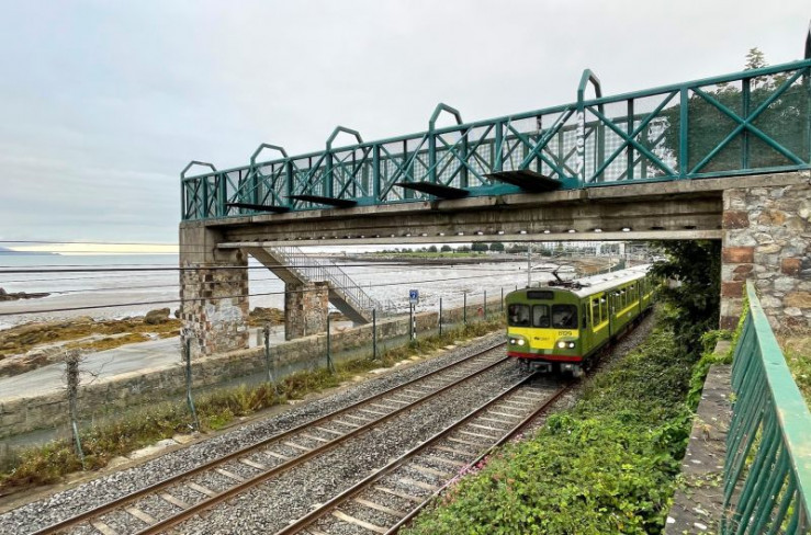 Der irische Nahverkehrszug DART fährt dicht an der Dublin-Bay entlang. Bei Ebbe zeigt sie sich als riesige Watt-Landschaft.