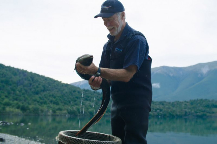 Ein weiterer Gigant Neuseelands schwimmt in den Bergseen und Flüssen: der Neuseeländische Langflossenaal. Er wird bis zu zwei Meter lang und kann bis zu 40 Kilogramm wiegen. Seit über 23 Millionen Jahren ist er ein gefürchteter Jäger. Sein Geruchssinn ist um ein Vielfaches besser als der des Weißen Hais. Da sein Bestand - wie der aller anderen Giganten - mittlerweile bedroht ist, erforschen Wissenschaftler die Geheimnisse seiner Reproduktion.