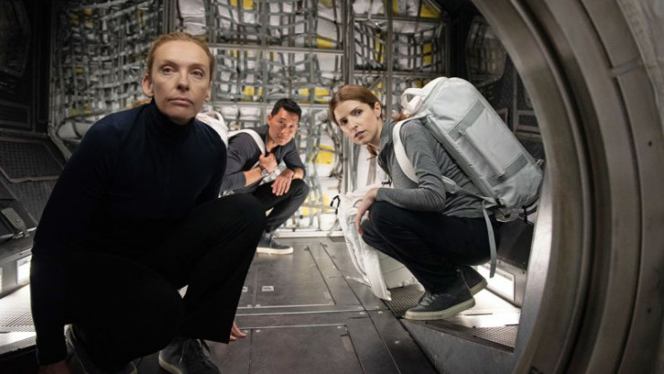 Wenige Stunden nach dem Start entdeckt die Crew (Toni Collette, li., Daniel David Kim, Anna Kendrick) einen unfreiwilligen blinden Passagier, Michael (Shamier Anderson)
