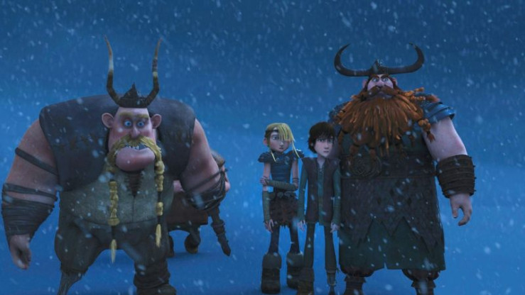 Astrid (Mi.), Hicks (2.v.re.) und die anderen Wikinger geraten in einen gefährlichen Schneesturm.