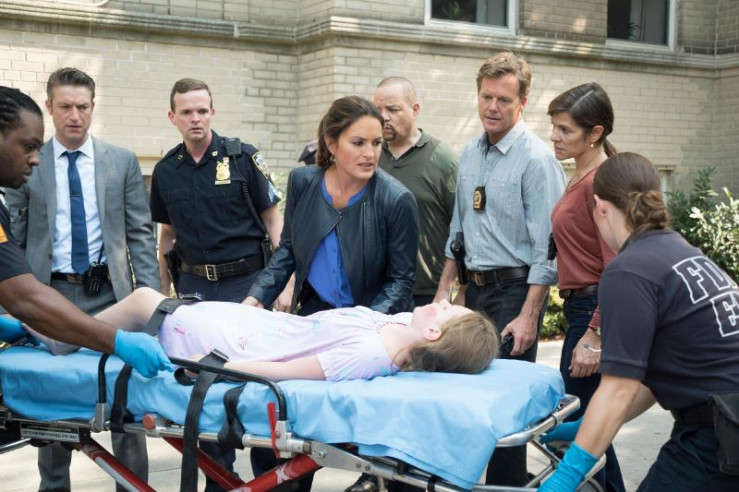 Dominick "Sonny" Carisi (Peter Scanavino, 2.v.l.), Olivia Benson (Mariska Hargitay, M.), Odafin 'Fin' Tutuola (Ice-T, 4.v.r.), Sophie Harris (Kylie McVey, liegend)