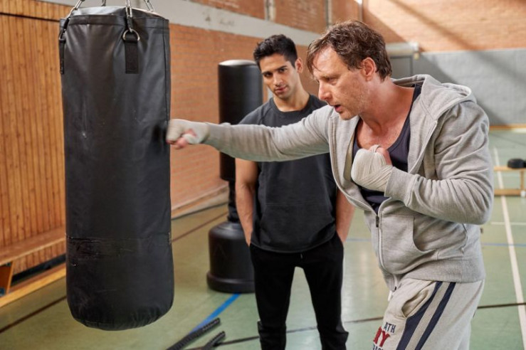 Stefan Vollmer (Hendrik Duryn, r.) bringt Cem (Daniel Rodic) bei, wie man sich im Leben durchboxt. +++ Die Verwendung des sendungsbezogenen Materials ist nur mit dem Hinweis und Verlinkung auf RTL+ gestattet. +++