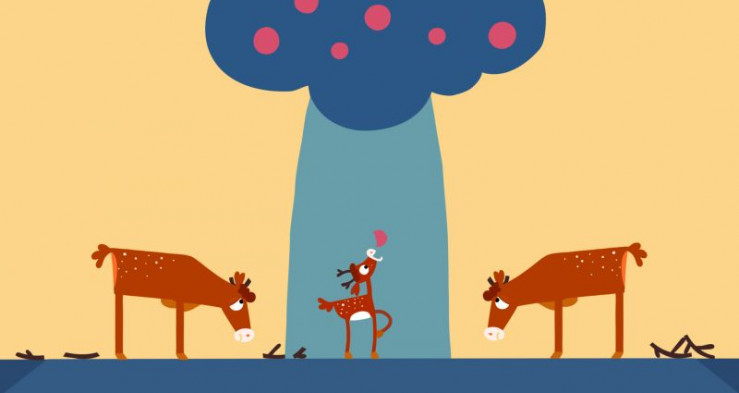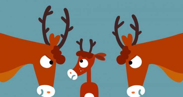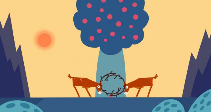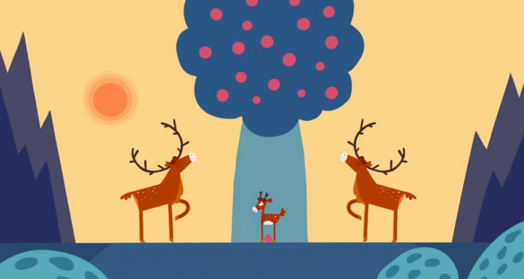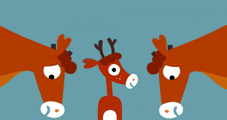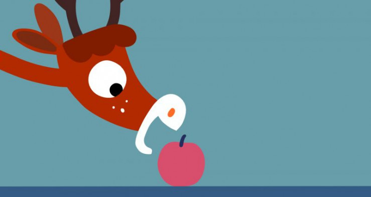 Das Hirschkalb will einen Apfel fressen. Doch nur der Platzhirsch kriegt den Apfel!