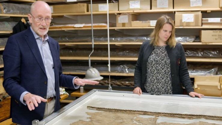 Olof Pipping und Johanna Sandström erzählen von der Besonderheit des Segels der "Vasa". Zehn Jahre hat dessen Restauration gedauert.