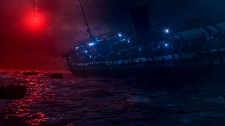 Weil sich das Schiff um 10, 15 Grad neigte, nachdem die drei sowjetischen Torpedos eingeschlagen waren, löste sich steuerbordseitig keines der Rettungsboote. (CGI-Animation)