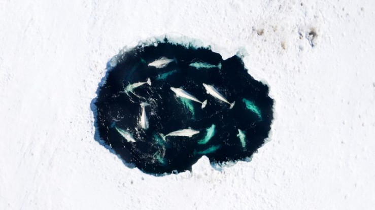 Mehr als 30 Kilometer vom nächsten offenen Gewässer entfernt, bietet dieses Eisloch vor dem östlichen Russland für eine Gruppe Belugawale den einzigen Zugang zu Sauerstoff.