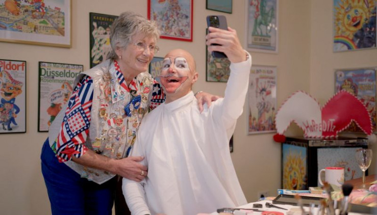 Hoppeditz Tom Bauer (r) und Visagistin Isburga Kühl.