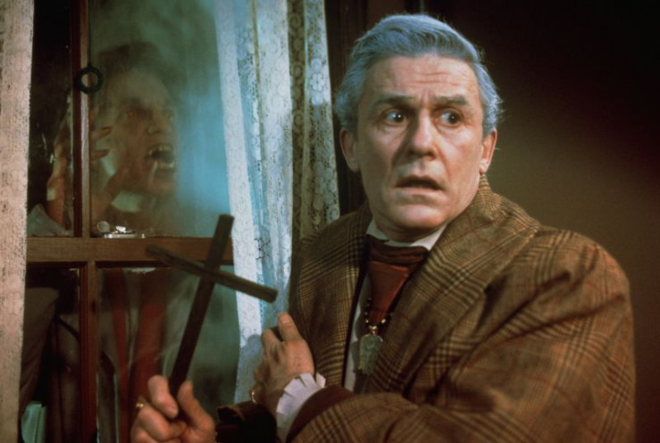 Peter Vincent (Roddy McDowall, r.) wehrt den Vampir Jerry Dandrige (Chris Sarandon, l.) mit seinem Kreuz ab.