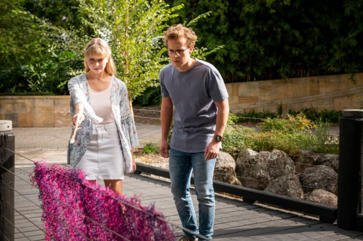 Lily (Mia Milnes, l.) und Peter (Jamie Carter, r.) haben die verzauberte Pflanze entdeckt, die einen ekligen Geruch verströmt und die Stimmen aller Passanten verzerrt. Lily versucht, den Zauber zu bannen.