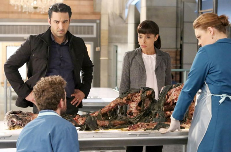 Nach der ausgelassenen Hochzeitsfeier steht für (v.l.) Hodgins (T.J. Thyne, Rückansicht), Arastoo (Pej Vahdat), Cam (Tamara Taylor) und Brennan (Emily Deschanel) ein neuer Mordfall an.