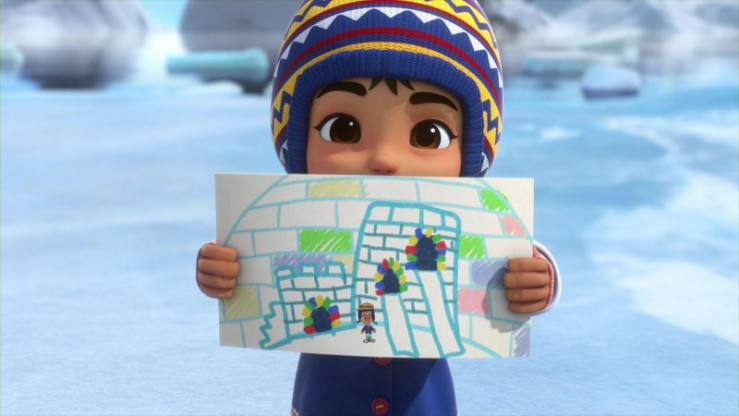 Crystal (re.) und Jett (li.) helfen Akaja bei dem Bau ihres umweltfreundlichen Iglu-Spielplatzes aus den mehrfarbigen Eisblöcken.