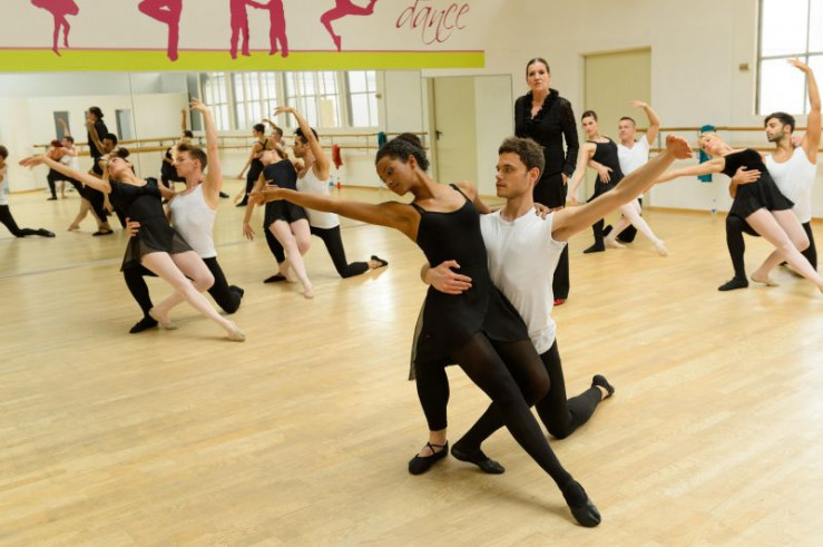 Felix (Hannes Sell, vorne) hat sich beim Training unter Aufsicht von Ludmilla (Kathy Karrenbauer, steh.) Letizia (Jennifer Dessin-Brasching, vorne l.) als Tanzpartnerin ausgesucht und brüskiert damit Raquel. +++ Die Verwendung des sendungsbezogenen Materials ist nur mit dem Hinweis und Verlinkung auf RTL+ gestattet. +++