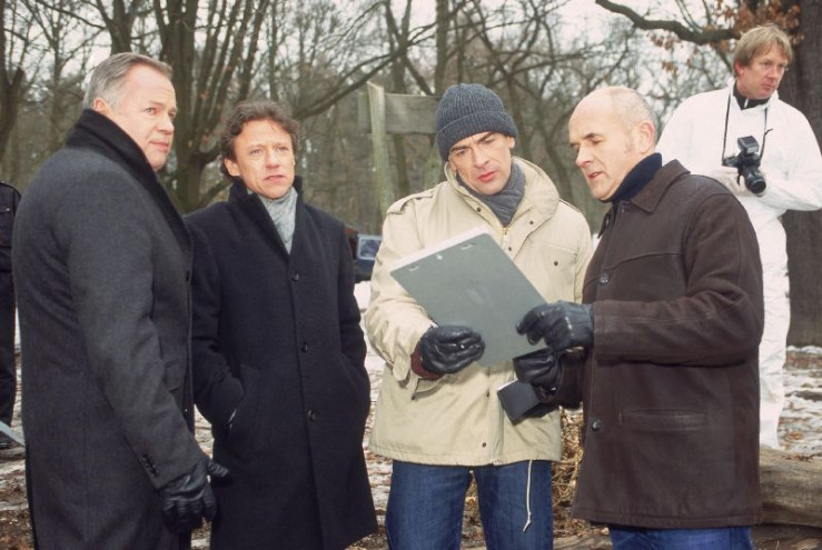 Eine Kinderleiche wurde gefunden. Kommissar Kehler (Wolfgang Bathke, li.), Oberstaatsanwalt Kampen (Axel Pape, 2.v.li.) und Kommissar Bonhoff (Wolfgang Krewe, 3.v.li.) lassen sich die ersten Ergebnisse des Gerichtsmediziners Dr. Duhler (Klaus Schindler, 2.v.re.) zeigen.