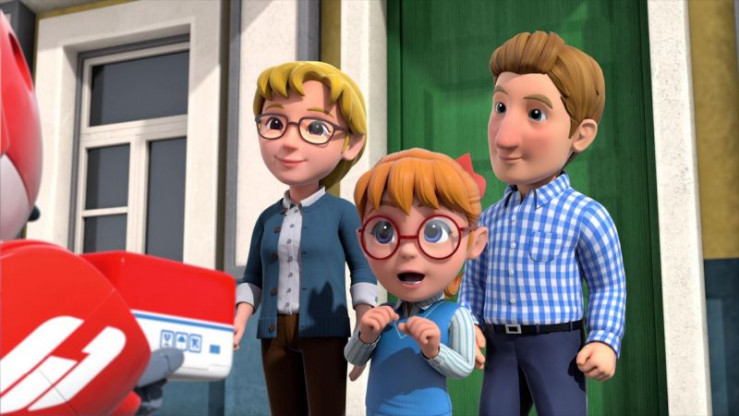 Nika (mi.) möchte mit Astra (li.) und Jett (2.v.li.) ins Weltall fleigen, um dort das in ihrer Sammlung noch fehlende Weltraumgestein zu sammeln. Dazu bittet sie ihre Eltern (re.) um Erlaubnis.