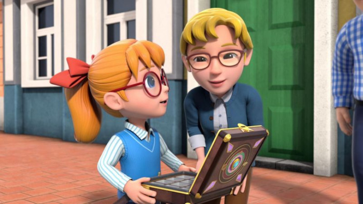 Astra (li.) ist Jetts (re.) Paketpartnerin auf seiner Reise nach Moskau. Dort wartet ein Mädchen auf ihre Steine-bestaune-Kiste, die sie bei den Super Wings bestellt hat.
