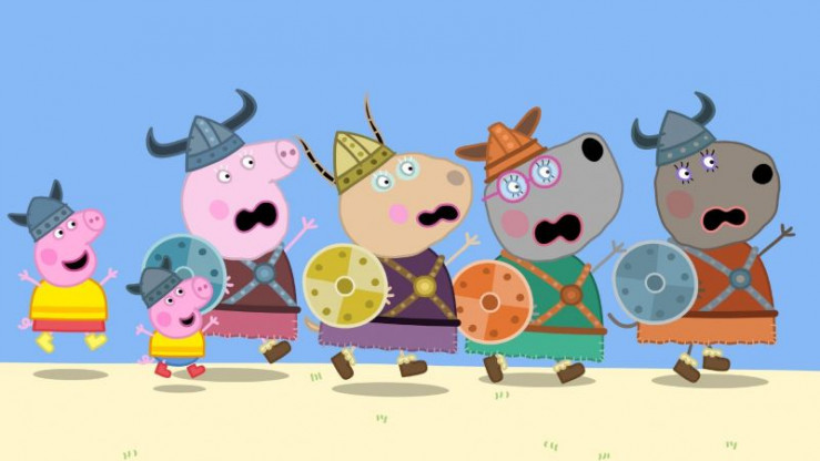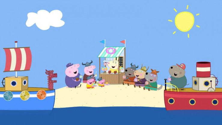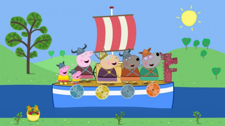 Heute verbringen Peppa und Schorsch (li.) den Tag mit Oma Wutz und ihren Freundinnen, um Wikinger zu spielen. Sie nutzen Opa Wutz' Boot als Wikingerschiff und stechen in See. Die Wikinger haben viel Spaß auf dem Boot, bis sie bemerken, dass sie ihren Proviant vergessen haben. Auf der Suche nach Essen machen sie einen Landgang und treffen letzten Endes auf Frau Mümmels Imbissstand. +++ Die Verwendung des sendungsbezogenen Materials ist nur mit dem Hinweis und Verlinkung auf RTL+ gestattet. +++