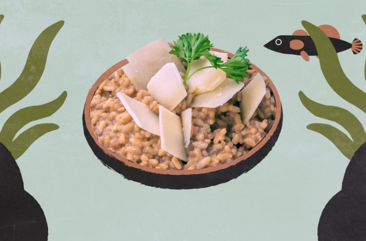 Der Chefkoch Marco Ballarin bereitet Risotto di gò zu. Die Hauptzutaten sind cremiger Reis und die Grundel, ein kleiner Fisch aus der Lagune von Venedig.