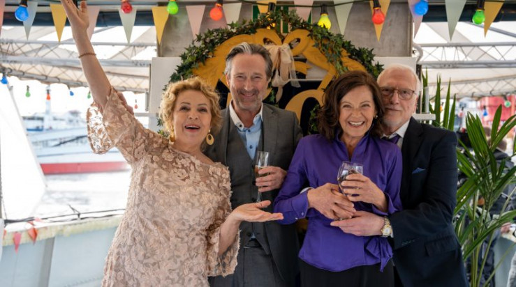 Ulla (Michaela May, 2. v. re.), Ritas Tochter Henriette (Katrin Ingendoh, Mitte) und Sina (Lieselotte Voß, re.) empfangen die Gäste für die goldene Hochzeitsfeier