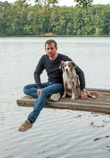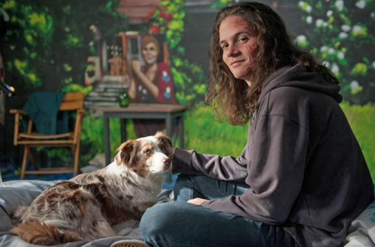 Paul (Christoph Schechinger) und Therapiehündin Käthe versuchen Chris (Tilman Pörzgen) wieder aufzurichten, der sich aufgrund von Brandnarben im Gesicht vor der Welt versteckt.