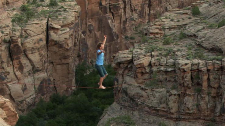 Adventurer Andy Lewis hikes into the Moab desert to walk a 40 metres high slackline.