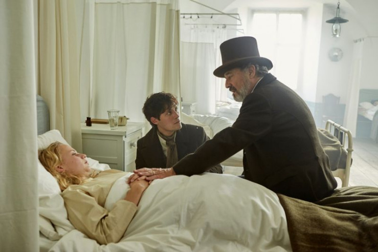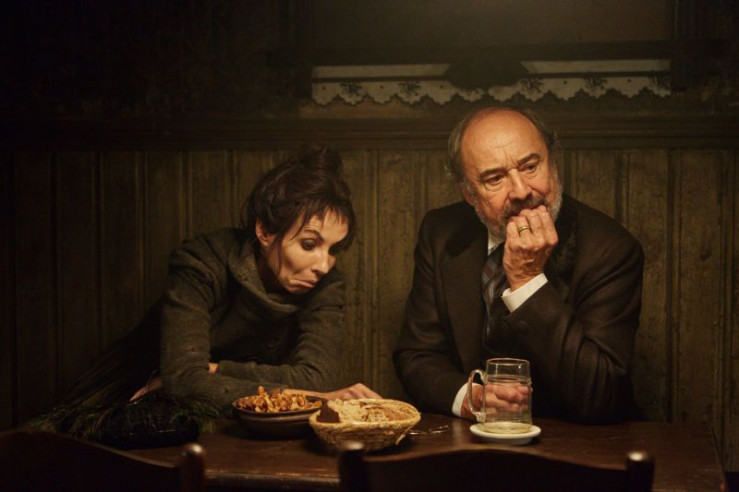 Am Bett der durch Liebeskummer sterbenskranken Laura (Dana Droppová) kommt es zu einer letzten Konfrontation zwischen Lauras Vater, dem Uhrmacher (Viktor Preiss, rechts) und Urban (Michael Balcar, Mitte), seinem ehemaligen Lehrling und Lauras Geliebten.